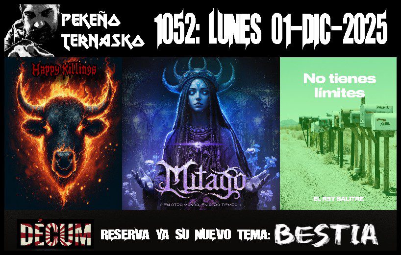 Novedades: Décum. Doble ESTRENO en EXCLUSIVA: EL Rey Salitre y Happy Killings. Fucking Master: Mitago. Hoy sonaron: Décum, El Rey Salitre, Happy Killings, Korpiklaani, Death Angel y Mitago. …Bienvenid@s…al show que transforma la rutina diaria del simple mortal en un DÍA ACOJONANTE para la gente que valemos la pena…LA GENTE DEL ROCK..!! Pekeño Ternasko 1052…