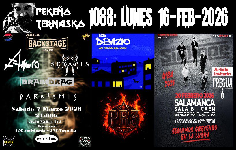 Secciones: Alerta y El Rey Salitre y además, como cada miércoles, Rincón Oscuro..!!! Hoy sonaron: Alerta, El Rey Salitre (que también cierra), Sypha, Hollow Front, Deathlatrix, Nervosa, Talco y Heavy Pettin’. …Bienvenid@s…al show que transforma la rutina diaria del simple mortal en un DÍA ACOJONANTE para la gente que valemos la pena…LA GENTE DEL ROCK..!!…