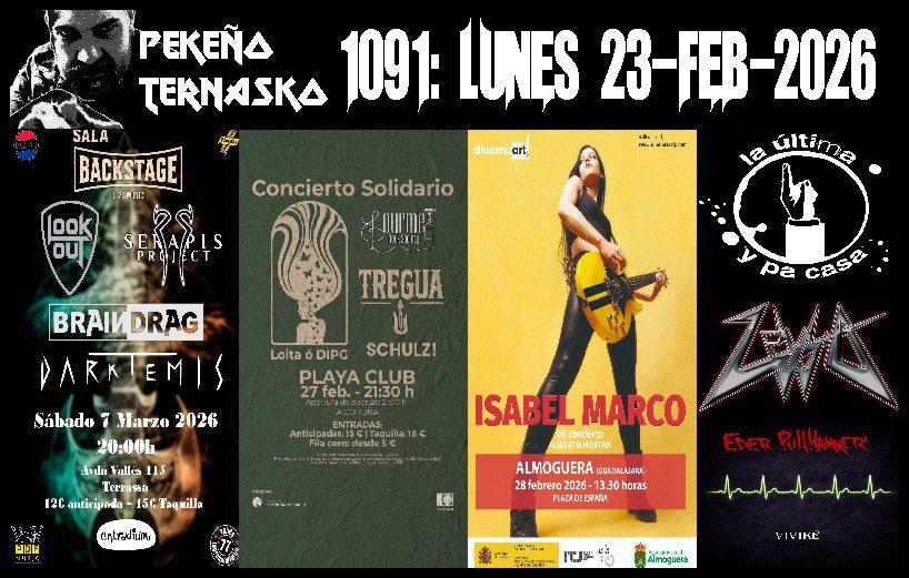 Viña RocKKR…más de lo mismo. Conciertos: Tregua, Braindrag e Isabel Marco. Secciones: La Última y Pa’casa, Zevo y Eder PullHammer. Hoy sonaron: Effe, Braindrag, Tregua, Zevo, Eder PullHammer, La Última y Pa’casa, Tungsten, Kadavar e Isabel Marco. …Bienvenid@s…al show que transforma la rutina diaria del simple mortal en un DÍA ACOJONANTE para la gente que…