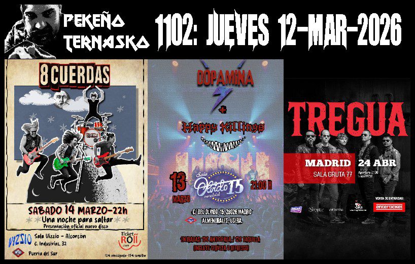 Conciertos: Effe, Doble Esfera, Salduie, Kalumnia. Secciones: Gayola y Warlock Choice. Hoy sonaron: Warlock Choice, Kalumnia, Doble Esfera, Salduie, EFFE, Gatola, Mojinos Escozíos, The Cloverhearts y Malevolence. …Bienvenid@s…al show que transforma la rutina diaria del simple mortal en un DÍA ACOJONANTE para la gente que valemos la pena…LA GENTE DEL ROCK..!! Pekeño Ternasko 1099 (09-03-26)…
