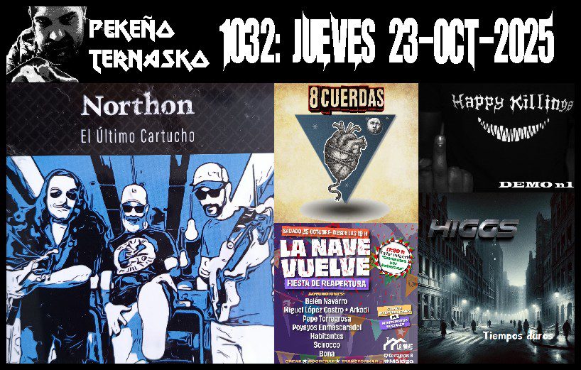 Doble estreno: 8 Cuerdas y Northon, que estárán en directo. Conciertos: Habitantes. Secciones: Higgs y Happy Killings. Hoy sonaron: Higgs, Habitantes, 8 Cuerdas, Happy Killings,… Leer más »Pekeño Ternasko 1032 (23-10-25)