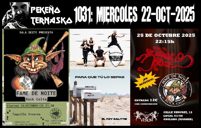 Conciertos: Doblete de Fame de Noite, que estrenan bajista. Novedades: El Rey Salitre. Y presentamos a Mister Sinmarc en #BandasAsociadas. Hoy sonaron: El Rey Salitre,… Leer más »Pekeño Ternasko 1031 (22-10-25)